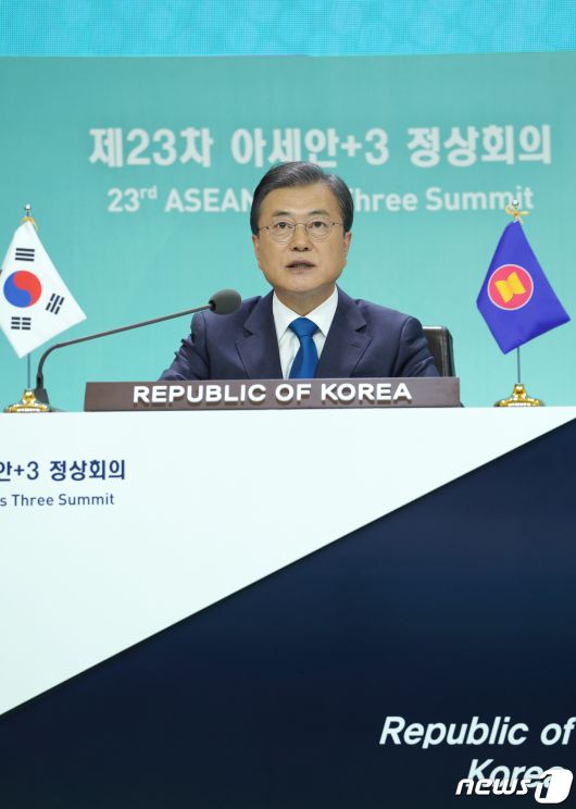 (서울=뉴스1) 유승관 기자 = 문재인 대통령이 14일 청와대 본관에서 화상으로 개최된 제23차 아세안+3 정상회의에서 발언을 하고 있다. 2020.11.14/뉴스1fotogyoo@news1.kr[© 뉴스1코리아(news1.kr), 무단 전재 및 재배포 금지]