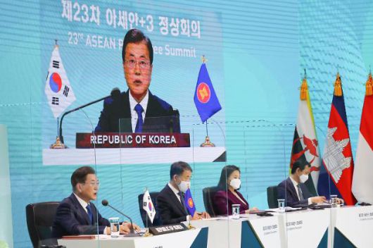 문재인 대통령은 14일 제23차 아세안+3 정상회의에서 “존경하는 의장님, 각국 정상 여러분, 특히 일본의 스가 총리님 반갑다”고 인사했다.