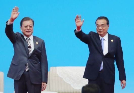 지난해 12월 중국 쓰촨성 청두에서 열린 박람회에 참석한 문재인 대통령과 리커창 중국 총리(오른쪽)가 다른 참석자들에게 손을 흔들어 인사하는 모습. 리 총리는 15일 한국, 중국 등이 참여한 RCEP가 타결된 것과 관련해 “다자주의와 자유무역의 승리”라며 커다란 의미를 부여했다. 연합뉴스 |