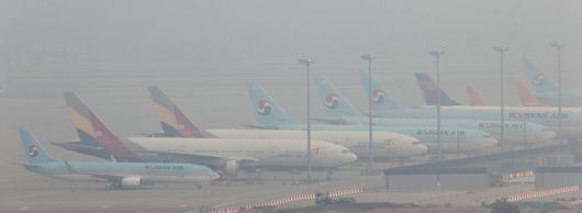 13일 오전 인천국제공항 주기장에 서있는 대한항공과 아시아나항공 항공기. 연합 |