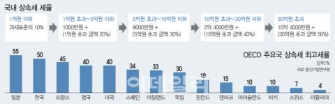 현행 상속세 최고 세율은 50%다. 상속액이 30억원을 초과할 경우 10억4000만원을 납부하고 30억원을 넘는 부분에 대해선 50%를 납부해야 한다. 이 같은 최고세율은 경제협력개발기구(OECD) 내에서 일본(55%)에 이어 두 번째다.