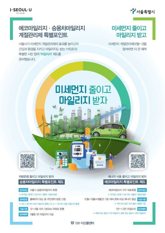 [헤럴드경제=한지숙 기자] 서울시는 다음달부터 내년 3월까지 ‘미세먼지 계절관리제’(미세먼지 시즌제) 기간에 에너지를 더 절감한 승용차 마일리지와 에코 마일리지 회원에게 특별 포인트를 준다고 16일 밝혔다. |