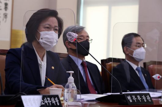 추미애 법무부 장관이 16일 오전 서울 여의도 국회에서 열린 법제사법위원회 전체회의에 출석해 의원들 질의에 답하고 있다. 왼쪽부터 추미애 법무부 장관, 최재형 감사원장, 조재연 법원행정처장. 이상섭 기자/babtong@heraldcorp.com |