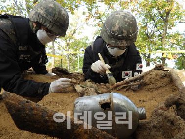 강원 철원 비무장지대 화살머리고지 일대에서 유해 발굴 중인 장병들(사진=국방부). |