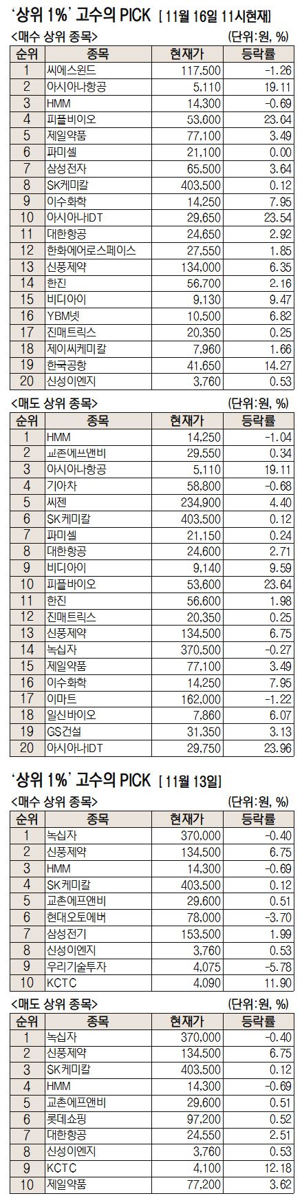 매수 2위 종목은 아시아나항공으로 나타났다. 대한항공을 보유한 한진그룹의 아시아나항공 인수 추진에 아시아나항공 관려련들은 투자자들의 집중 관심을 받고 있다. 고수들은 HMM, 피플바이오, 제일약품 등도 많이 사들인 것으로 집계됐다.