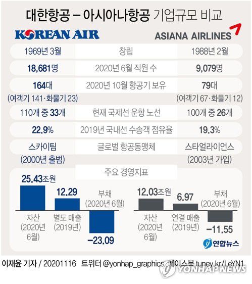 2019년 여객과 화물 운송실적 기준으로 대한항공 19위, 아시아나항공 29위로, 양사 운송량을 단순 합산하면 세계 7위권으로 상승한다.