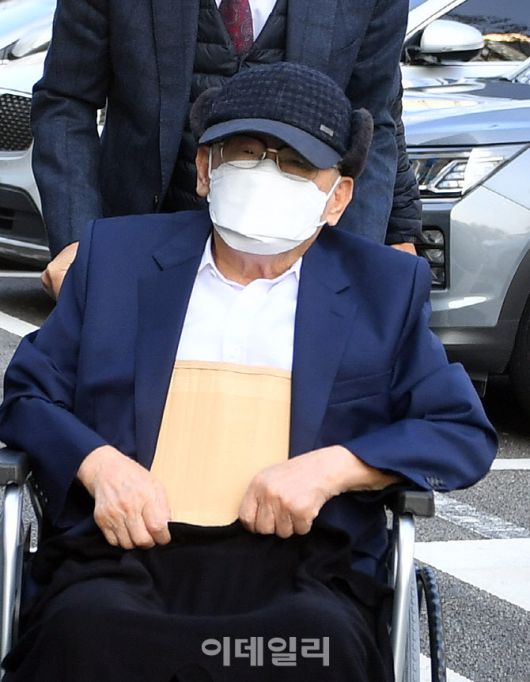 [이데일리 방인권 기자] 감염병예방법 위반 등 혐의로 구속기소됐다가 최근 건강 악화 등을 이유로 보석 석방된 신천지예수교 증거장막성전(신천지) 이만희 총회장이 16일 오후 경기도 수원시 영통구 수원지방법원에서 열린 재판에 휠체어를 타고 출석하고 있다.