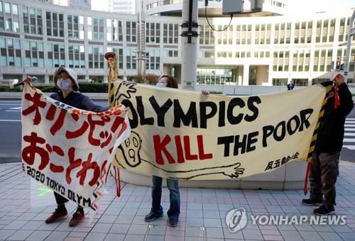 이날 도쿄도청 앞에서는 올림픽에 반대하는 시민들이 영어로 '올림픽이 가난한 이들을 죽인다'는 주장을 담은 글 등이 적인 현수막을 들고 시위를 벌였다.