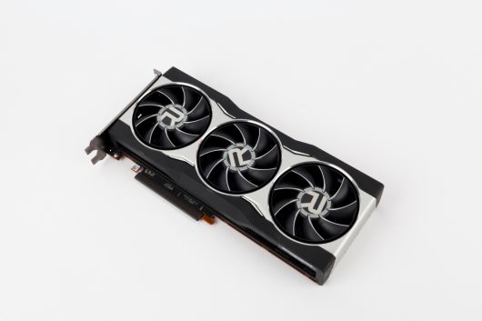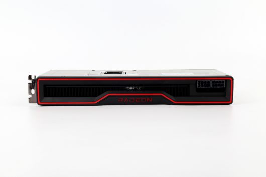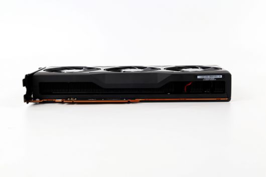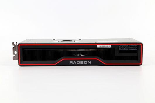 상단 디자인 역시 RX 6800과 비슷하다. 전원을 켜면 RADEON 조명이 붉게 빛나는 것 역시 동일하다. 다만 RX 6800보다 성능이 뛰어난 만큼 방열판의 무게가 더 두껍다. 슬롯 사이즈가 RX 6800보다 두꺼운 것도 이와 연관이 깊다. 전원포트는 8핀 2개를 사용하며, 소비전력은 300W다.