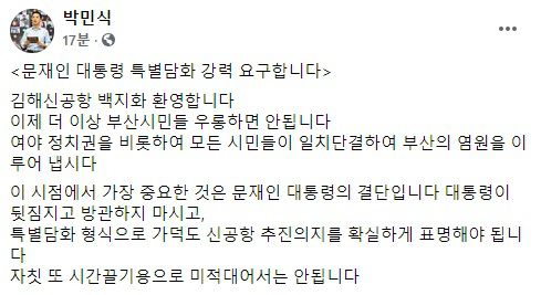 그는 "이 시점에서 가장 중요한 것은 문재인 대통령의 결단"이라며 "대통령이 뒷짐지고 방관하지 마시고, 특별담화 형식으로 가덕도 신공항 추진의지를 확실하게 표명해야 된다. 자칫 또 시간끌기용으로 미적대서는 안된다"고 말했다.