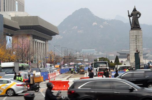 17일 오전 서울시 종로구 광화문광장에서 ‘사람이 쉬고 걷기 편한 광장’으로 조성하는 공사가 진행되고 있다. 이는 지난 9월 발표한 광화문광장 일대 변경 계획을 실행하는 것으로, 동쪽(주한미국대사관 앞) 차로 확장 공사를 시작해 서쪽(세종문화회관 앞) 도로를 광장으로 조성하는 공사까지 순차적으로 이어갈 계획이다. (사진=연합뉴스) |
