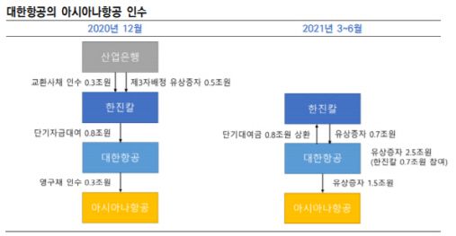 앞서 대한항공은 오는 12월 3,000억원 규모 영구채와 내년 상반기 1조5,000억원어치 신주를 인수하는 등 두 단계에 걸쳐 아시아나항공 지분을 취득할 계획이라고 지난 16일 밝혔다. 산업은행이 교환사채(3,000억원)취득과 제3자배정 유상증자(5,000억원)에 참여, 한진칼(180640)에 자금을 투입하고 이를 대한항공에 단기대여하는 구조다. 신주 인수 후 대한항공은 아시아나항공의 지분 약 65%를 보유할 예정이다.