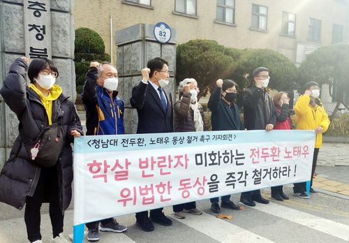 5·18 청남대 동상 철거 국민행동은 17일 도청 앞에서 기자회견을 해 "오늘 이시종 충북지사와 면담에서 동상을 그대로 두고, (두 전직 대통령이) 법의 처벌을 받았다는 내용을 적시하겠다는 답변을 받았다"고 전했다.