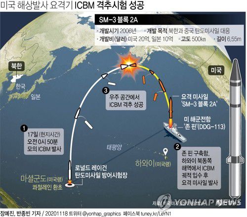 (워싱턴=연합뉴스) 류지복 특파원 = 미국이 해군 함정에서 쏘아 올린 미사일 요격기로 모의 대륙간탄도미사일(ICBM)을 격추하는 시험에 성공했다고 미국 미사일방어청(MDA)이 17일(현지시간) 밝혔다.