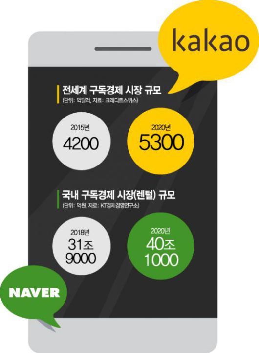 네이버에 이어 카카오가 구독경제 시장에 뛰어드는 것은 성장 가능성 때문이다. 글로벌 투자은행 크레디트스위스는 전세계 구독경제 시장 규모가 2015년 4200억달러에서 2020년 5300억달러로 성장할 것으로 전망했다. KT 경제경영연구소에 따르면 렌털 등을 포함한 국내 시장은 2018년 31조9000억원 규모에서 2020년 40조1000억원까지 커질 것으로 조사됐다.