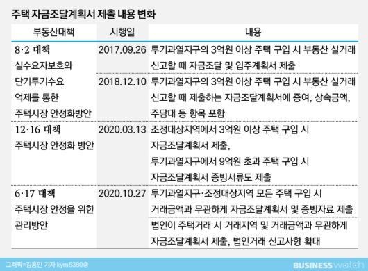 이후 최근까지 점점 수위를 높여가며 강화되고 있는데요. 올해 6‧17대책에서 한 번 더 규제 수위를 높여 지난달 27일부터 투기과열지구‧조정대상지역 내 주택이라면 거래금액과 무관하게 자금조달계획서와 증빙자료를 제출해야 합니다.