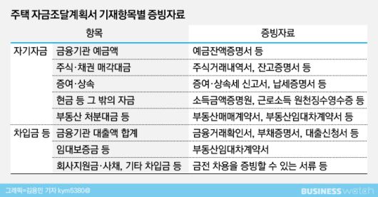 이 항목별로 증빙자료도 함께 제출해야 하는데요. 금융기관 예금액은 예금잔액증명서, 주식·채권 매각대금은 주식거래내역서 등 자금조달계획을 입증할만한 자료를 준비하면 됩니다.