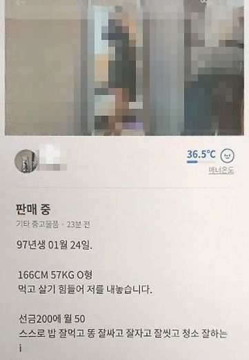 지난 18일 경남 진주시 하대동 지역 이용자는 당근마켓에 '97년생 1월 24일. 166cm 57kg 0형. 먹고 살기 힘들어 저를 내놓습니다'라는 글을 올렸다. 이용자는 판매 금액으로 '선금 200에 월 50'을 제시하면서 원피스를 입고 찍은 사진도 첨부했다. 이어 "스스로 밥 잘먹고, 잘자고, 잘씻고, 청소 잘한다"며 본인을 설명했다. 하지만 판매자가 사진 속 인물과 동일인인지 확인되지는 않았다.