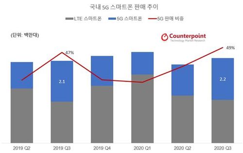 작년 3분기에는 국내에서 판매된 스마트폰의 47%가 5G 스마트폰이었다. 올해 2분기 5G 판매 비중은 39%였으나, 3분기에는 49%로 비중이 높아졌다.