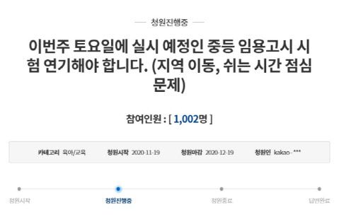 전날 청와대 홈페이지 국민청원 게시판에는 ‘이번주 토요일에 실시 예정인 중등 임용고시 시험 연기해 합니다.(지역 이동, 쉬는 시간 점심 문제)’라는 제목의 글이 올라오기도 했다.
