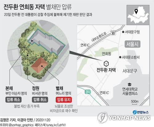 (서울=연합뉴스) 황재하 기자 = 전두환 전 대통령의 서울 서대문구 연희동 자택을 공매에 넘긴 검찰의 조치가 일부 위법이라는 법원의 판단이 나왔다.