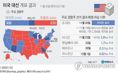 이어 30일 애리조나, 다음 달 1일에는 위스콘신주의 개표 결과 인증이 예정돼 있다. 이 두 곳은 바이든 당선인의 승리가 예측된 곳이다.