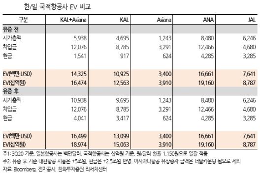 김유혁 연구원은 “EV 측면으로 보면 대한항공과 아시아나항공의 합산 EV는 16조원으로 추정된다”며 “유상증자로 인한 시가총액 증분 5조원, 현금성자산 증분 2조5000억원을 반영해도 일본 ANA의 현재 EV(19조원)와 유사하다”고 설명했다.