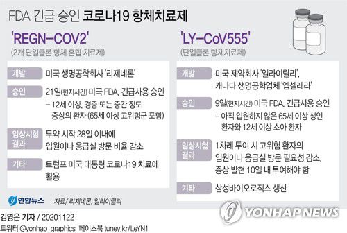 (서울=연합뉴스) 김용래 기자 = 미국의 생명공학회사 리제네론의 신종 코로나바이러스 감염증(코로나19) 항체 치료제가 미 식품의약국(FDA)으로부터 긴급사용 승인을 받았다.