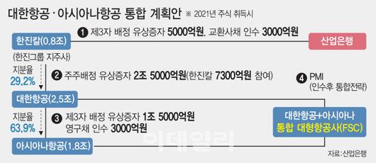 앞서 한진그룹 지주사인 한진칼과 대한항공은 지난 16일 아시아나항공을 인수하겠다고 밝혔다. 코로나19 장기화로 경영난인 가운데 항공산업의 구조개편을 위한 고육지책이었다. 한진칼은 산은을 상대로 5000억원 규모의 제3자 배정 유상증자를 실시함과 동시에 3000억원 규모의 EB(교환사채)를 사모방식으로 발행, 총 8000억원을 지원받기로 했다.