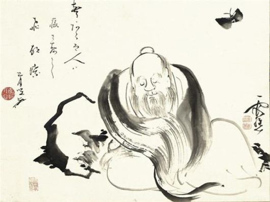 일본 에도시대 이케노 다이가가 그린 호접몽 그림. 눈을 감고 있는 장자와 주변의 나비를 묘사했다. 장자가 눈을 감고 있는 것을 볼 때 이것은 장자의 관점에서 그린 호접몽이다. |