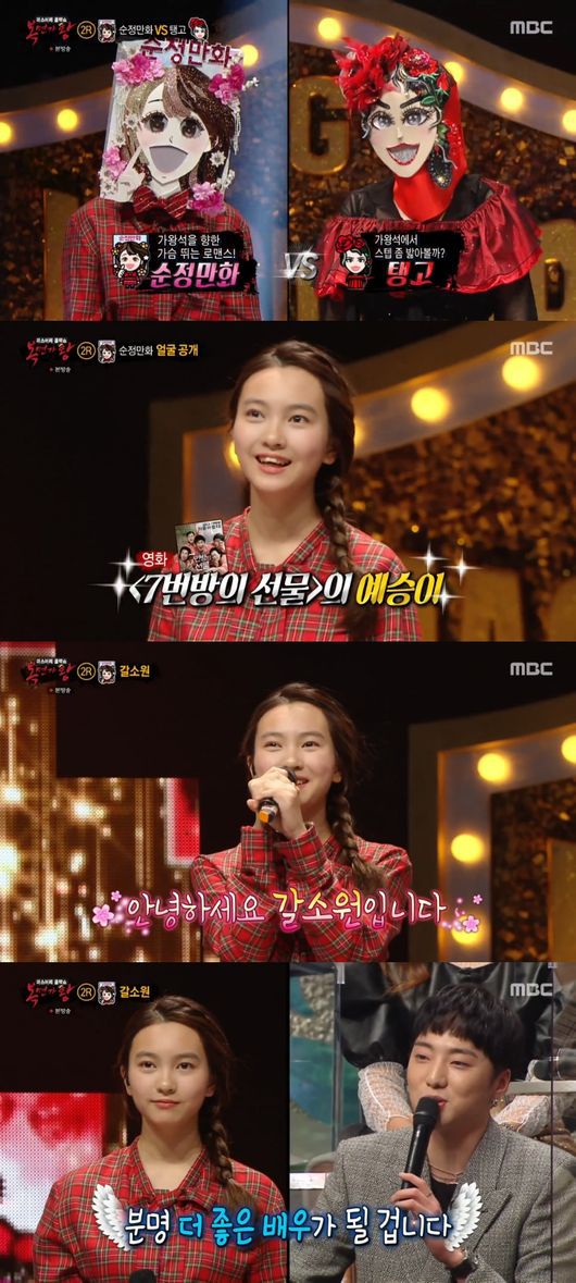 2라운드 첫 대결은 순정만화와 탱고가 나섰다. 순정만화는 신승훈의 ‘처음 그 느낌처럼’을, 탱고는 티삼스의 ‘매일 매일 기다려’를 선곡했다. 승자는 11표를 얻은 탱고였다. 10표에 그친 순정만화의 정체는 영화 ‘7번방의 선물’ 등에 출연한 아역 배우 갈소원이었다.
