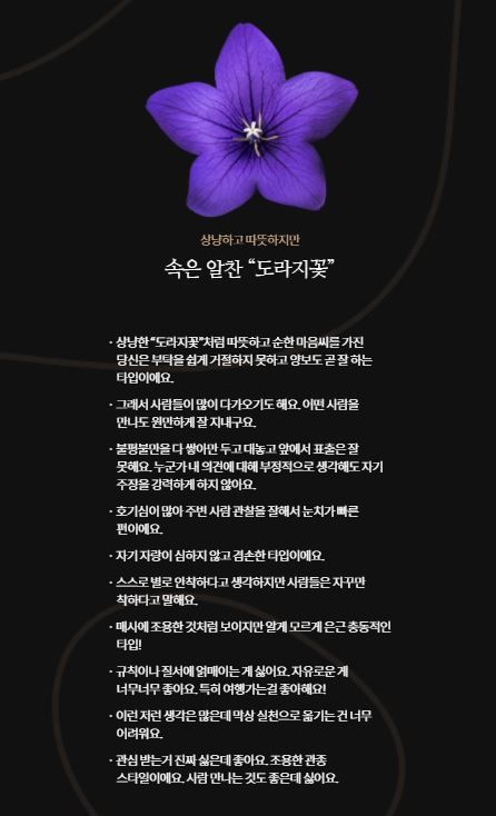 도화 테스트의 마지막 화면에는 자신의 성향과 맞는 꽃의 이름이 등장, 해당 꽃이 어울리는 사람들의 성격을 예측한 내용이 나열돼있다.