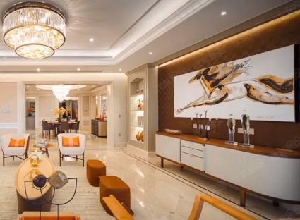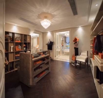 공개된 사진 속에는 반짝이는 대리석 바닥과 샹들리에, 주황색, 갈색이 포인트가 되는 가구 배치, 일반적인 욕실보다 큰 옷방 등이 담겼다.