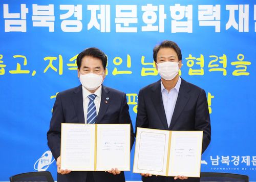 (용인=연합뉴스) 김인유 기자 = 경기 용인시는 24일 시청 영상회의실에서 남북경제문화협력재단(이하 경문협)과 '남북 도시 간 교류 협력 추진을 위한 업무협약'을 체결했다.