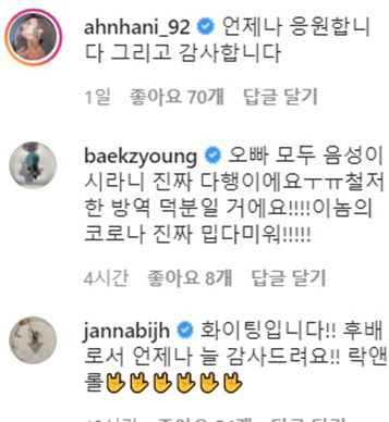 이에 그룹 EXID 출신 하니는 "언제나 응원합니다. 그리고 감사합니다"라는 댓글을 남겼다. 또 가수 백지영은 "오빠 모두 음성이시라니 진짜 다행이에요. 철저한 방역 덕분일 거에요!!!! 이놈의 코로나 진짜 밉다 미워!!!!!"라는 댓글을 달아 눈길을 끌었다.