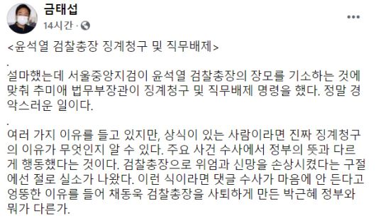 더불어민주당을 탈당한 금태섭 전 의원이 지난 24일 추미애 법무부 장관의 윤석열 검찰총장 직무 배제 결정과 관련해 "서울중앙지검이 윤 총장 장모를 기소하는 것에 맞춰 추 장관이 징계청구 및 직무배제 명령을 했다. 정말 경악스러운 일"이라고 했다.