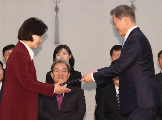 문재인 대통령이 지난 1월 2일 청와대에서 추미애 법무부 장관에게 임명장을 수여하고 있다. [연합] |