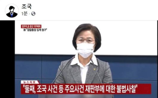 특히 조 전 장관은 "수사를 제대로 하는 검사는 어떻게든 자른다는 것"이라며 윤 총장을 비호하는 한편 박근혜 행정부를 비판했다. 당시 윤 총장이 법무부와 갈등을 빚고 직무에서 배제된 데 대해 '윤석열 찍어내기'라고 비판한 것.