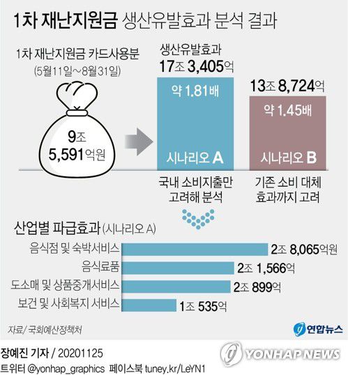 25일 국민의힘 추경호 의원 의뢰로 예산정책처가 분석한 보고서를 보면, 지난 5월 11일∼8월 31일 1차 긴급재난지원금 가운데 카드사용분 9조5천591억원의 생산유발효과는 최대 17조3천405억원으로 분석됐다. 약 1.81배의 효과가 나타났다는 의미다.