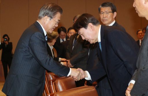 문재인 대통령이 2019년 11월 8일 청와대 본관 집현실에서 열린 '공정사회를 향한 반부패정책협의회'에서 윤석열 검찰총장과 악수를 하고 있는 모습. 청와대사진기자단 |