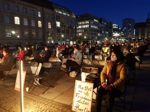 베를린 시민들은 25일 저녁 미테 지역으로 베를린의 가장 대표적인 광장 중 하나인 젠다르멘마르크트에서 시위를 벌였다.