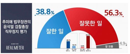 리얼미터가 TBS 의뢰로 26일 발표한 여론조사에 따르면 추미애 법무부 장관의 윤 총장 직무 정지에 대한 평가를 물은 결과 ‘잘못한 일’이라는 응답이 56.3%로 다수를 차지했다. ‘잘한 일’라는 응답은 38.8%로 집계됐다.