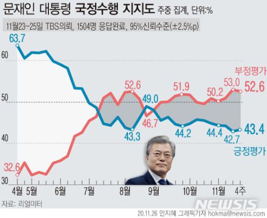 여론조사 전문업체 리얼미터가 TBS의뢰로 지난 23~25일 전국 18세 이상 유권자 1504명을 대상으로 실시해 26일 발표한 11월 4주차 주중 잠정집계 조사에 따르면 문 대통령의 국정수행 지지율은 전주 대비 0.7%포인트 오른 43.4%로 조사됐다.