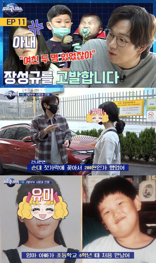 이후 장성규의 아내는 "전 여자친구 어머니를 보고 숨었다", "나한테 계속 전화해서 밥 사달라고 했다", "재수하면서 힘들다면서 여자친구 사귀었잖아. 내가 첫사랑 맞아?" "내가 여자친구 두 명을 알잖아"라고 장성규에 대한 폭로를 하며 입담을 과시했다. 이에 장성규는 "두 명만 아는구나"라고 반격해 보는 이들을 폭소케 했다.