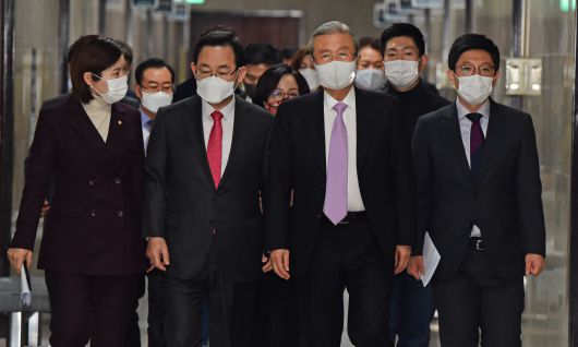 김종인 국민의힘 비상대책위원장과 주호영 원내대표를 비롯한 비대위원들이 26일 국회에서 열린 비상대책위원회의에 참석하고 있다. [이상섭 기자/babtong@heraldcorp.com] |