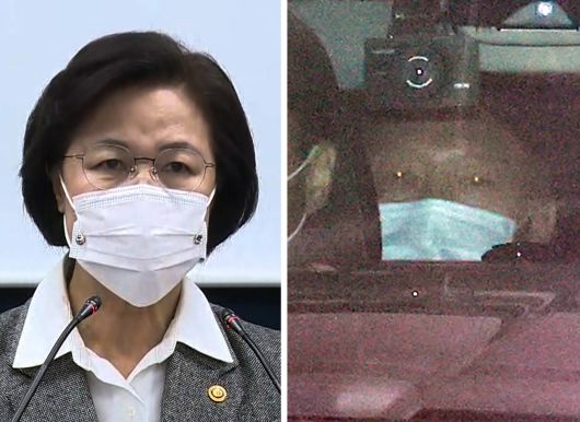 윤석열 검찰총장이 24일 오후 서울 서초동 대검찰청에서 퇴근하고 있다(오른쪽 사진). 앞서 추미애 법무부 장관이 서울고등검찰청 기자실에서 윤 총장에 대한 감찰 결과와 관련해 징계청구 및 직무배제 방침을 밝히고 있다. [연합] |