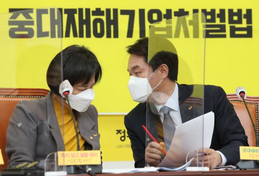 김종철 정의당 대표(오른쪽)와 강은미 원내대표가 25일 국회에서 열린 상무위원회에서 논의하고 있다. 이상섭 기자 babtong@heraldcorp.com |