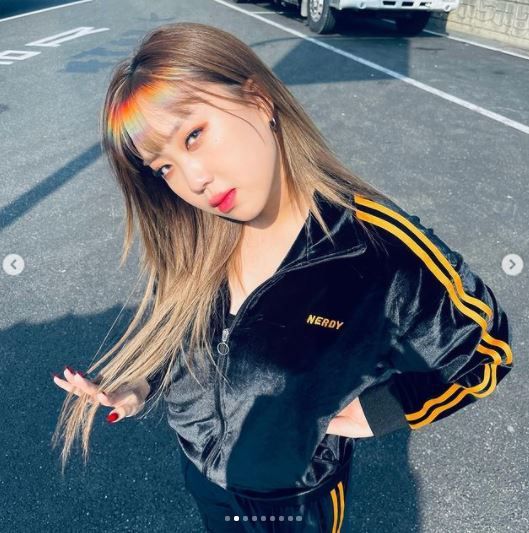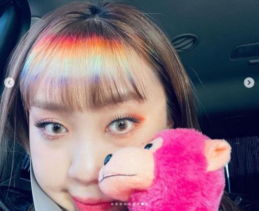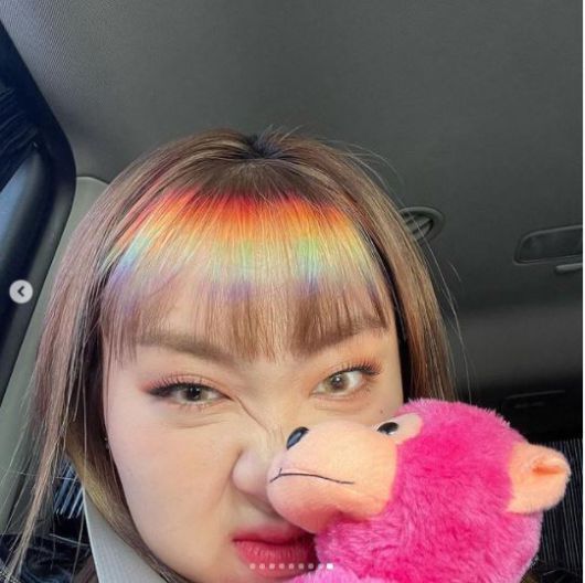 사진 속 이영지는 진짜 무지개 혹은 사진 애플리케이션 필터라고 착각할 것만 같은 현실감 넘치는 색으로 염색한 앞머리를 자랑했다. 그의 화려한 앞머리가 시선을 사로잡는다.