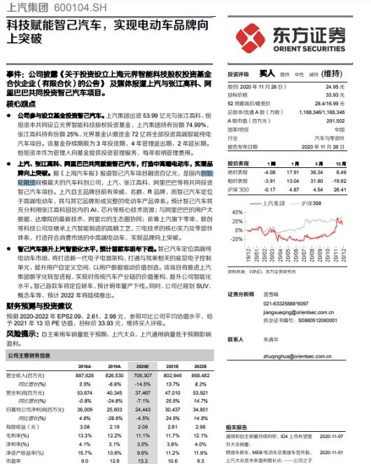 이와 관련, 중국 둥팡증권은 27일 보고서에서 2020~2022년 상하이자동차 예상 매출을 각각 7063억, 8029억, 8684억 위안으로, 직전년도 대비 각각 -14.5%, 13.7%, 8.2% 증가할 것으로 전망했다. 같은기간 영업이익은 374억, 470억, 539억 위안으로, 직전년도 대비 증가율은 각각 -7.1%, 25.5%, 14.7%에 달할 것으로 예상했다. 이 기간 주당순이익(EPS)은 각각 2.09/2.61/2.98위안으로 내다봤다. 목표주가는 33.93위안으로, 투자의견은 '매입'을 유지했다.
