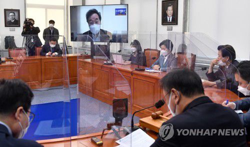 최고위원회의에 화상으로 참석해 발언하는 이낙연 대표 |